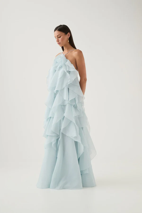 A gathered halter neckline frames the shoulders, while the cascading silhouette creates effortless volume and soft dimension. Light-catching and romantic, it’s a statement in motion — perfect for sunset occasions and luminous evenings.